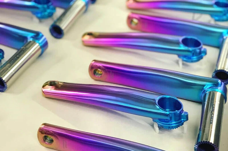 Titanium anodizing is a process that increases the thickness of the natural oxide layer on the surface of titanium, thereby improving its corrosion resistance, wear resistance, and appearance. The process involves immersing the titanium component in an electrolyte and applying a direct current to form a durable oxide film. The color effect can be controlled by adjusting the applied voltage.